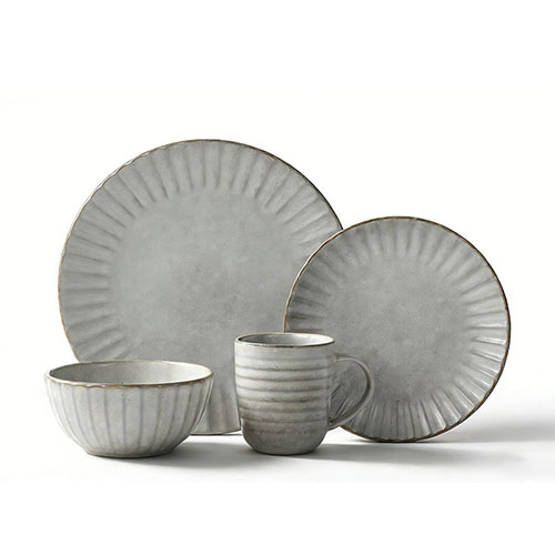 16-Piece grey-white stoneware set with kiln-changed relief patterns. Stylish, durable tableware for daily meals.