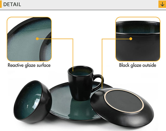 The green reactive dinner set 16pcs has a unique appearance, adding an unrepeatable trendy tone to the shiny glazed tableware. Wholesale only. MOQ 2000sets for customization.