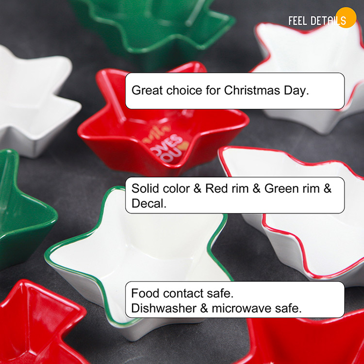 Crafted from high-quality ceramic, these bowls are designed to resemble a Christmas tree and a star. The Christmas tree-shaped bowl features intricate details such as ornaments, lights, and a star topper. Wholesale only. MOQ 3000pcs/each item for customization.