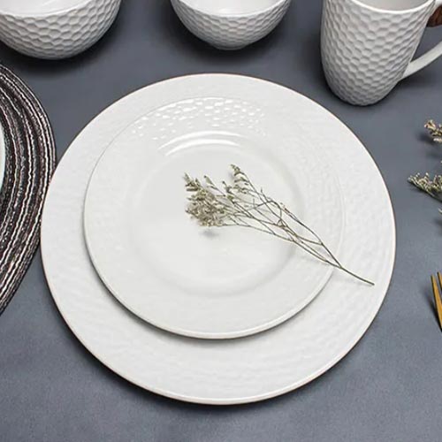This white ceramic dinner set with embossed design is featured with simple appearance and wear-resisting, microwave oven and dishwasher safe. Wholesale only. MOQ 8000pcs each item for customization.