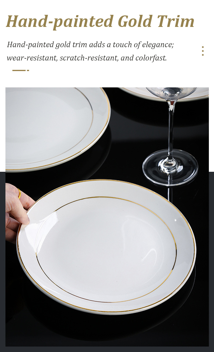 These gold-rimmed dinner plates are suitable for hotels, restaurants, and weddings, for serving steaks, pasta, desserts, etc. They are microwave, oven, dishwasher, and sterilizer safe. Custom logos are available.